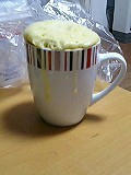 3、粉っぽさがなくなるまで混ぜ、高い位置から細くマグカップに生地をそそぐ。